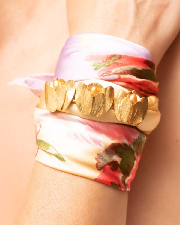 We present our versatile and bold multifunctional silk scarf, adorned with a charming pendant featuring three tulips that can be worn as a headband, necklace, bracelet, or hair accessory. Discover elegance and sophistication in every use, and transform your style with this unique gem. Make every day a special occasion!