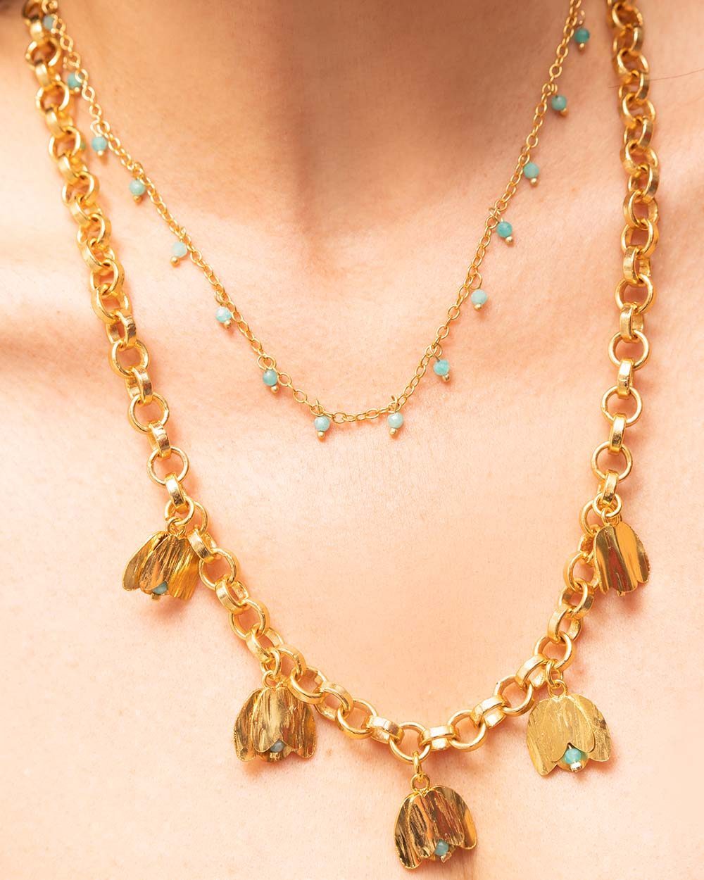 The Bella Forever necklace is a unique piece that elevates your style from the first glance. Featuring two stunning chains plated in 24K gold, this piece is designed to make you stand out with sophistication and charm on any occasion. The design includes a thicker chain adorned with five delicate tulip charms, each featuring a white pearl, adding a luxurious and feminine touch. The second, thinner chain is beautifully decorated with a row of pearls, creating a classic and refined look. Available in white pearls, rubies, or turquoise amazonite, it’s the perfect choice for any event, whether casual or formal.