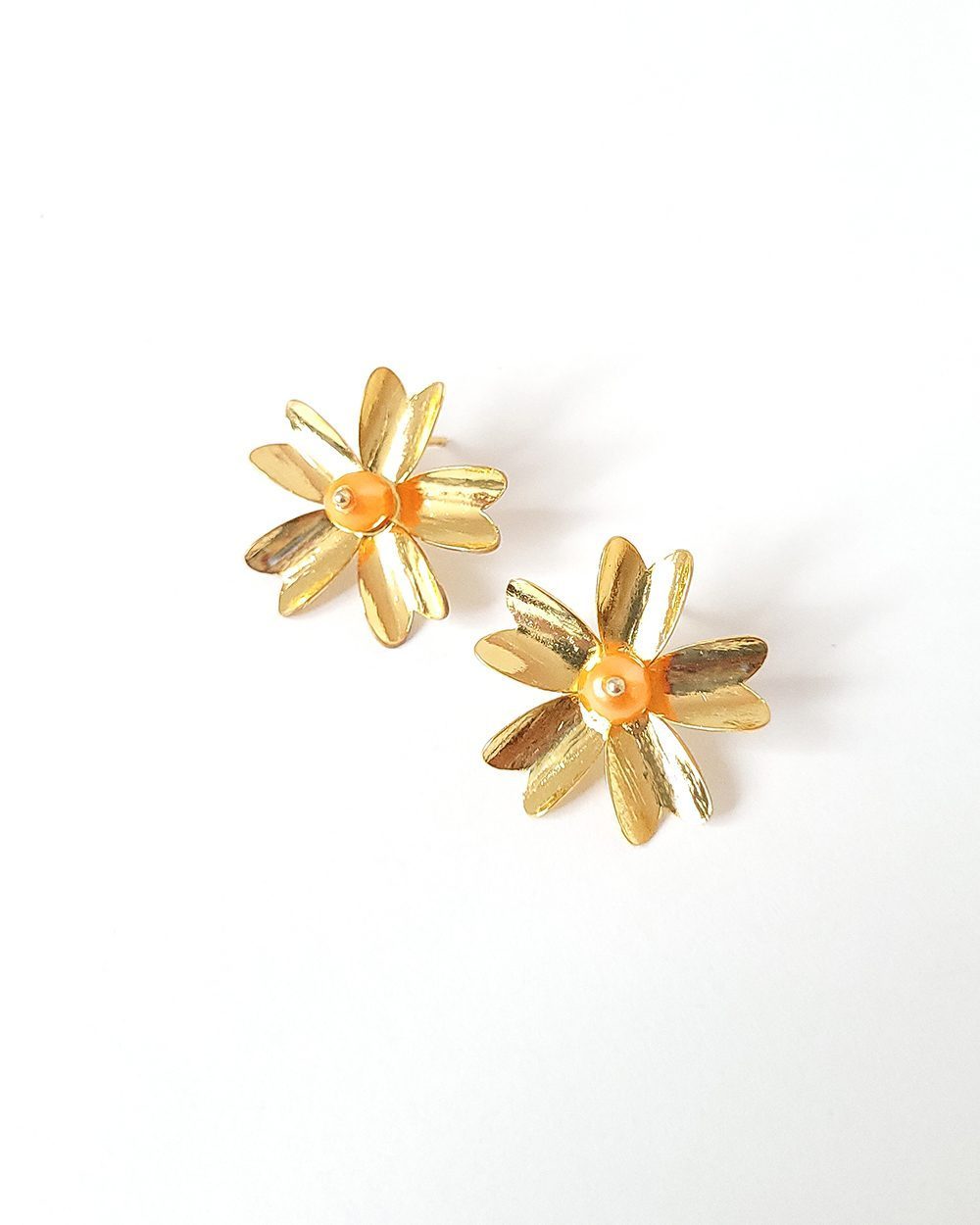 These beautiful earrings are the must-have trend in jewelry for every woman. Perfect for daily wear, they add a touch of elegance and sophistication to any outfit, ensuring your look stands out. Whether for a casual day or a special evening, these earrings will elevate your style and transform any moment into something unforgettable. Meticulously handcrafted and adorned with 24K gold plating, they feature a delicate five-petal flower design, making them a striking and beautiful piece. A fine example of exquisite craftsmanship, they are the perfect gift for someone special. Available in green, orange, white pearls, and fuchsia agate.